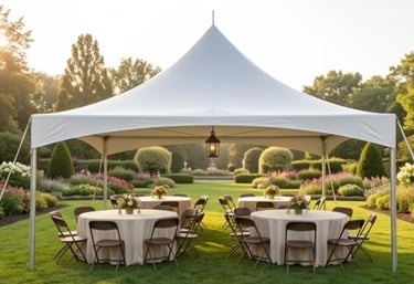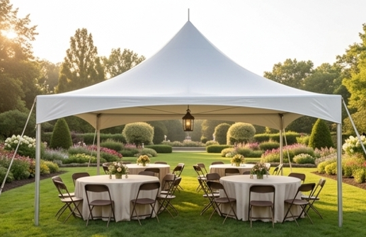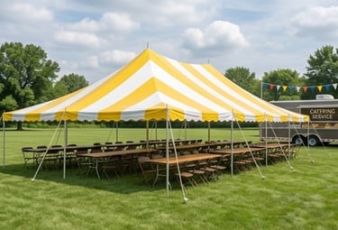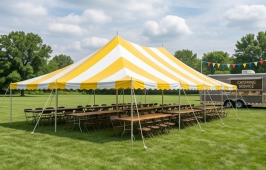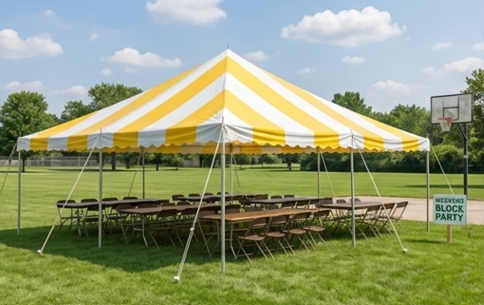 High-Peak Yellow & White Striped. (8) 8' Banquet Tables, (64) Brown Folding Chairs. Best For: Weekend mid-sized events and community block parties. $450 plus full-service delivery.