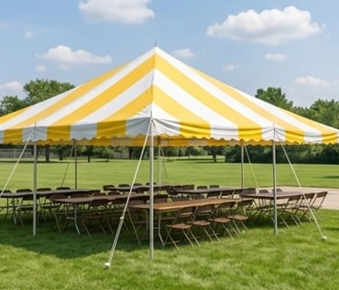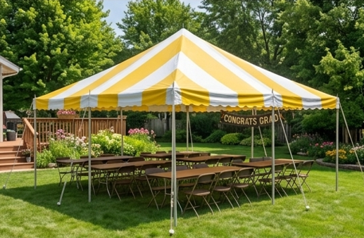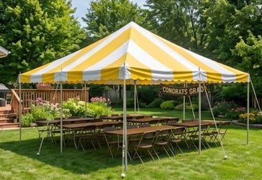High-Peak Yellow & White Striped. (6) 8' Banquet Tables, (48) Brown Folding Chairs. Best For: Graduation parties, birthday, and casual gatherings. $325 plus full-service delivery.